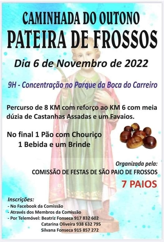 Este domingo a Comissão de Festas de São Paio de Frossos vai organizar a Caminhada do Outono. O percurso é de 8km pela Pateira de Frossos, com um reforço de castanhas assadas ao km 6.