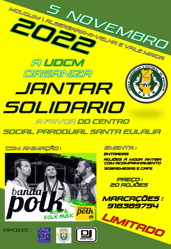A União Desportiva e Cultural de Mouquim está a organizar um jantar solidário a favor do Centro Social Paroquial Santa Eulália. A ementa inclui entradas, rojões à moda antiga com acompanhamento e ainda sobremesas e café, pelo valor de 20€.