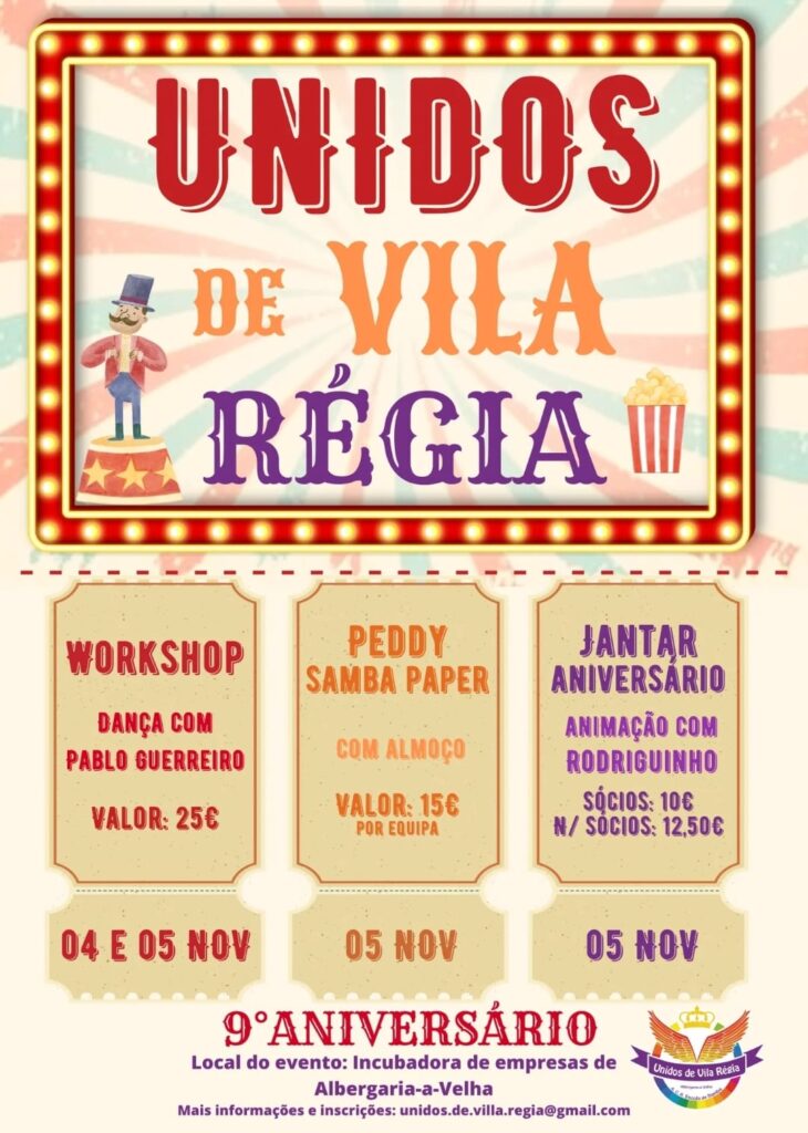 Os Unidos de Vila Régia começam as celebrações do 9º aniversário com um Peddy Samba Paper, às 8h deste sábado. Os participantes inscritos podem contar com um passeio pelas ruas de Albergaria, enquanto aprendem mais sobre o concelho e a história dos Unidos de Vila Régia.