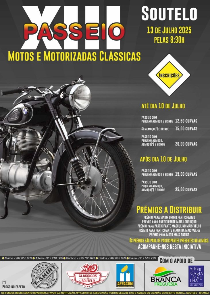 O XIII Passeio de Motas e Motorizadas Clássicas, grande evento anual dos Clássicos de Soutelo, está marcado para dia 13 de julho, às 8h30, com partida do Parque dos Moinhos do Porto de Riba. A receita resultante do encontro reverte, como é habitual, para a APPACDM de Albergaria-a-Velha.