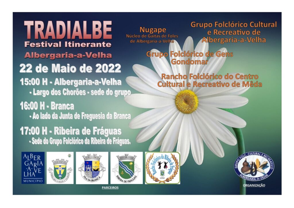 - Ao início da tarde, pelas 15h, vai acontecer o Tradialbe, Festival Itinerante. O Grupo Folclórico Cultural e Recreativo de Albergaria-a-Velha, o Grupo Folclórico de Gens Gondomar, o Nugape – Núcleo de Gaitas de Foles de Albergaria-a-Velha e o Rancho Folclórico do Centro Cultural e Recreativo de Mêda, vão atuar às 15h no Largo dos Chorões em Albergaria-a-Velha, às 16h junto à Junta de Freguesia da Branca, e às 17h na sede do Grupo Folclórico de Ribeira de Fráguas, em Ribeira de Fráguas.