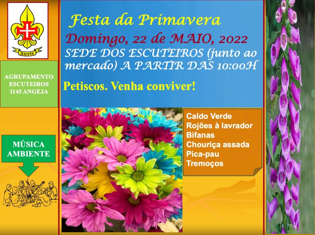 - Os escuteiros de Angeja estão a organizar uma Festa da Primavera. Na sede dos escuteiros, em Angeja, o evento vai ter música ambiente e comida variada. Começa às 10h.