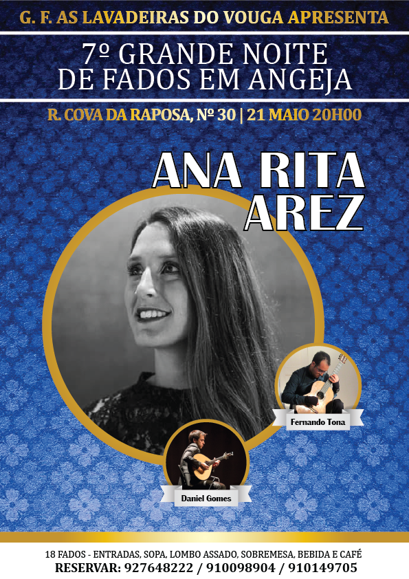 - Mais tarde, às 20h, tem lugar a sétima Noite de Fados, organizada pelo Grupo Folclórico Lavadeiras do Vouga, de Angeja. O espetáculo vai ter a atuação de Ana Rita Arez, acompanhada de Fernando Tona e Daniel Gomes. O concerto vai acontecer na Rua Cova da Raposa, nº30.