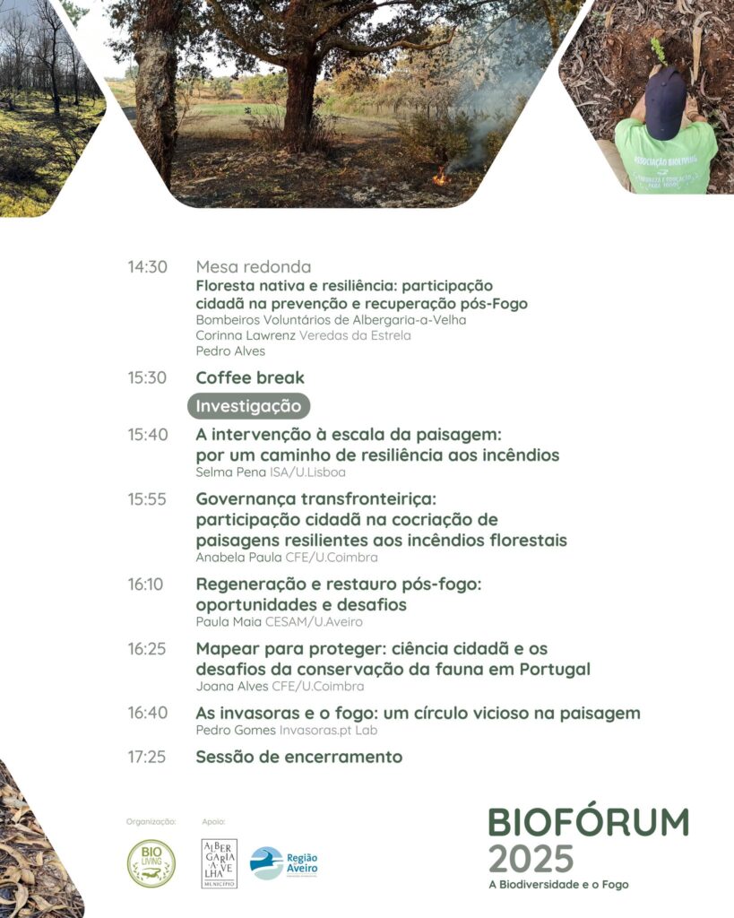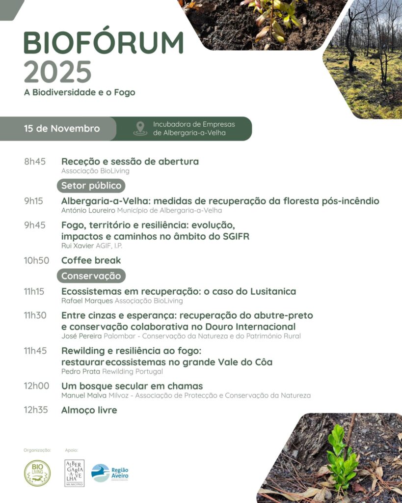 A Associação BioLiving organiza, no próximo dia 15 de novembro, a 9.ª edição do BioFórum, sob o mote “A Biodiversidade e o Fogo: Como coexistir?” e já divulgou, através das redes sociais, o programa completo. O evento decorrerá na Incubadora de Empresas de Albergaria-a-Velha e propõe um dia inteiro de reflexão sobre os impactos dos incêndios florestais na natureza e sobre estratégias para promover uma paisagem mais resiliente.
