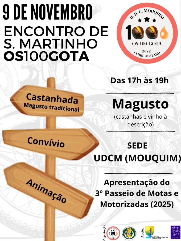 O grupo motard Os 100 Gota da União Desportiva e Cultural de Mouquim vai celebrar a data com um magusto à discrição, a partir das 17h, na sede da coletividade. Quem se juntar à festa vai ficar a conhecer os detalhes da terceira edição do Passeio de Motas e Motorizadas do clube, agendado para 2025.