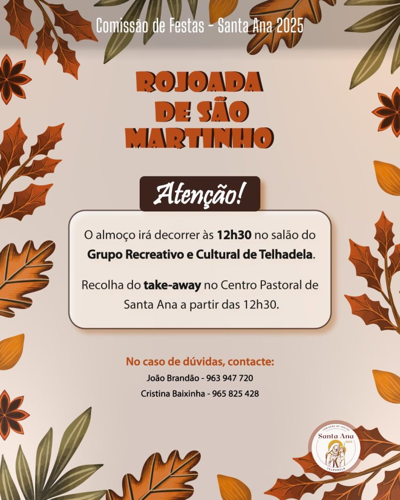 A Comissão de Festas de Santa Ana, no Centro Pastoral em Telhadela, apresenta atuações musicais ao vivo e com as tradicionais castanhas da época. O almoço de rojões, migas e batata assada tem a opção de serviço de take-away. O almoço decorre no salão do Grupo Recreativo e Cultural de Telhadela.