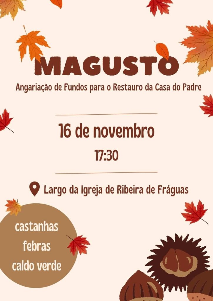 A Paróquia de São Tiago da Ribeira de Fráguas prepara um Magusto destinado à angariação de fundos para as obras na Casa do Padre; a partir das 17h30 no Largo da Igreja da freguesia. A organização assegura castanhas assadas, febras, caldo-verde e muito convívio.