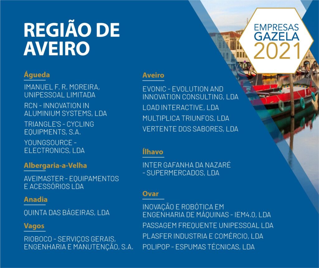 As “Gazela” são empresas que, num curto espaço de tempo, cresceram exponencialmente, diferenciando-se das restantes pela capacidade de gestão e pelos riscos que assumem. As distinções são atribuídas com base num estudo efetuado pela Comissão de Coordenação e Desenvolvimento Regional do Centro (CCDR-C), tendo em conta as prestações do ano anterior. A região Centro conta com 91 empresas ‘Gazela’, que empregam 3.875 pessoas e geram um volume de negócios de 914 milhões de euros e 571 milhões de euros de exportações. 18 dessas empresas estão localizadas no território da Comunidade Intermunicipal da Região de Aveiro (CIRA), nomeadamente cinco na capital de distrito, outras cinco em Ovar e quatro em Águeda. Albergaria-a-Velha, Anadia, Ílhavo e Vagos figuram na lista com uma empresa por concelho. Na zona centro, o distrito aveirense é o que reúne o maior número de empresas Gazela 2021.