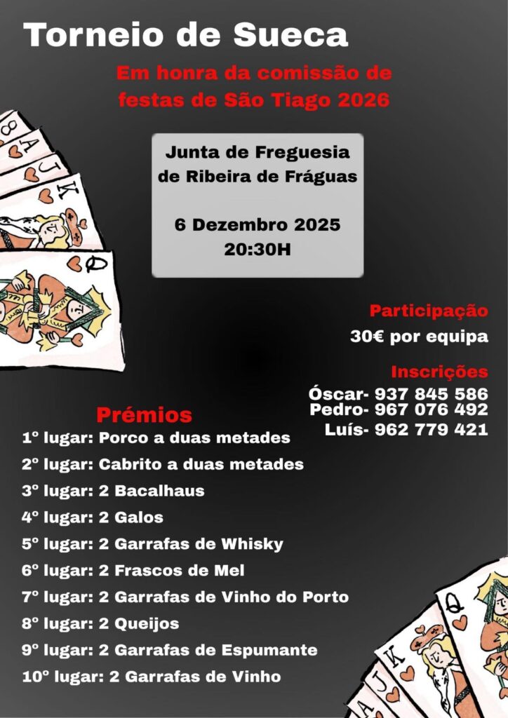 A Comissão de Festas S. Tiago organiza, às 20h30, um Torneio de Sueca, no Salão da Junta de Freguesia de Ribeira de Fráguas.