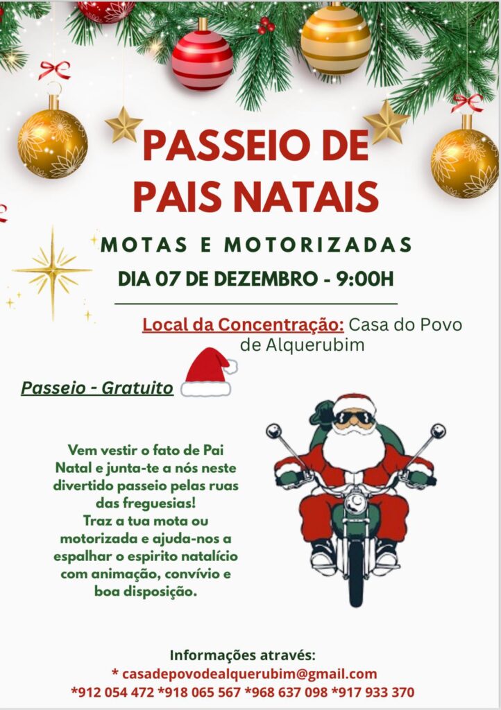 A Casa do Povo de Alquerubim prepara-se para levar o espírito natalício às ruas da freguesia e um pouco por todo o concelho, com o animado Passeio de Pais-Natais em motas e motorizadas, marcado para as 9h, com partida da sede da coletividade.
