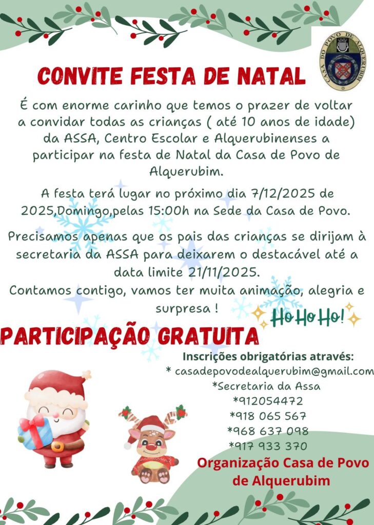 A Casa do Povo de Alquerubim volta a convidar todas as crianças até aos 10 anos de idade da ASSA e Centro Escolar e de Alquerubim a participar na Festa de Natal da coletividade, já este domingo, a partir das 15h, na sede da Casa do Povo.