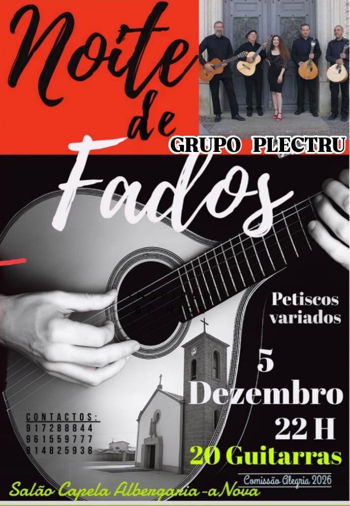 A Comissão da Nossa Sra. da Alegria apresenta uma Noite de Fados, às 22h, no Salão da Capela de Albergaria-a-Nova. O grupo Plectru será o protagonista do espetáculo.