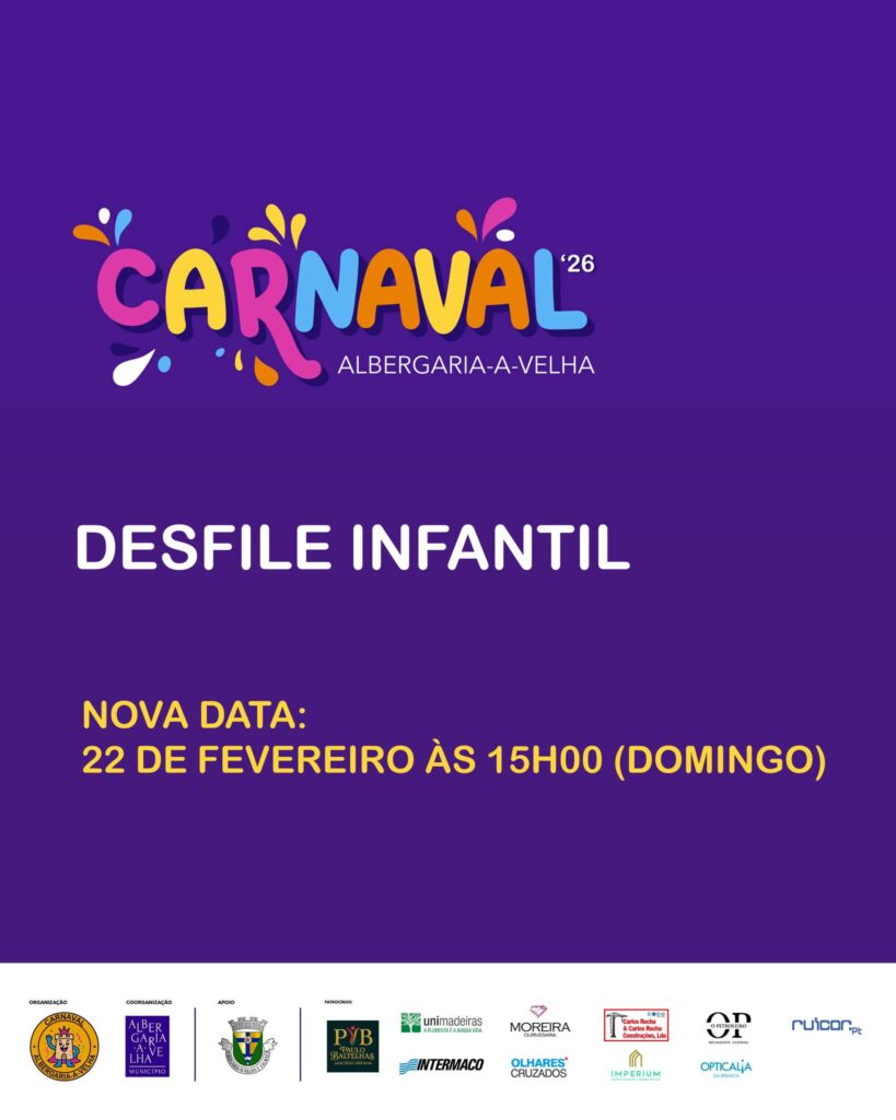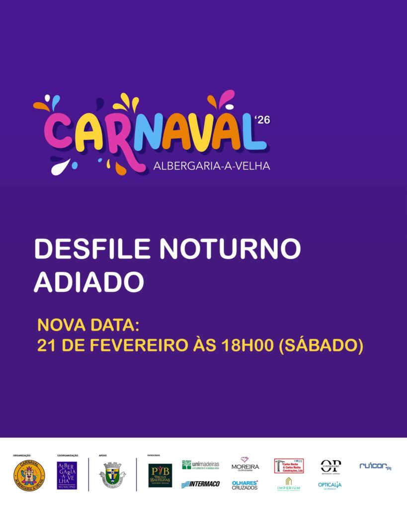 O segundo desfile noturno do Carnaval de Albergaria, inicialmente marcado para o dia 16 de fevereiro, foi adiado para este sábado, 21 de fevereiro, às 18h.