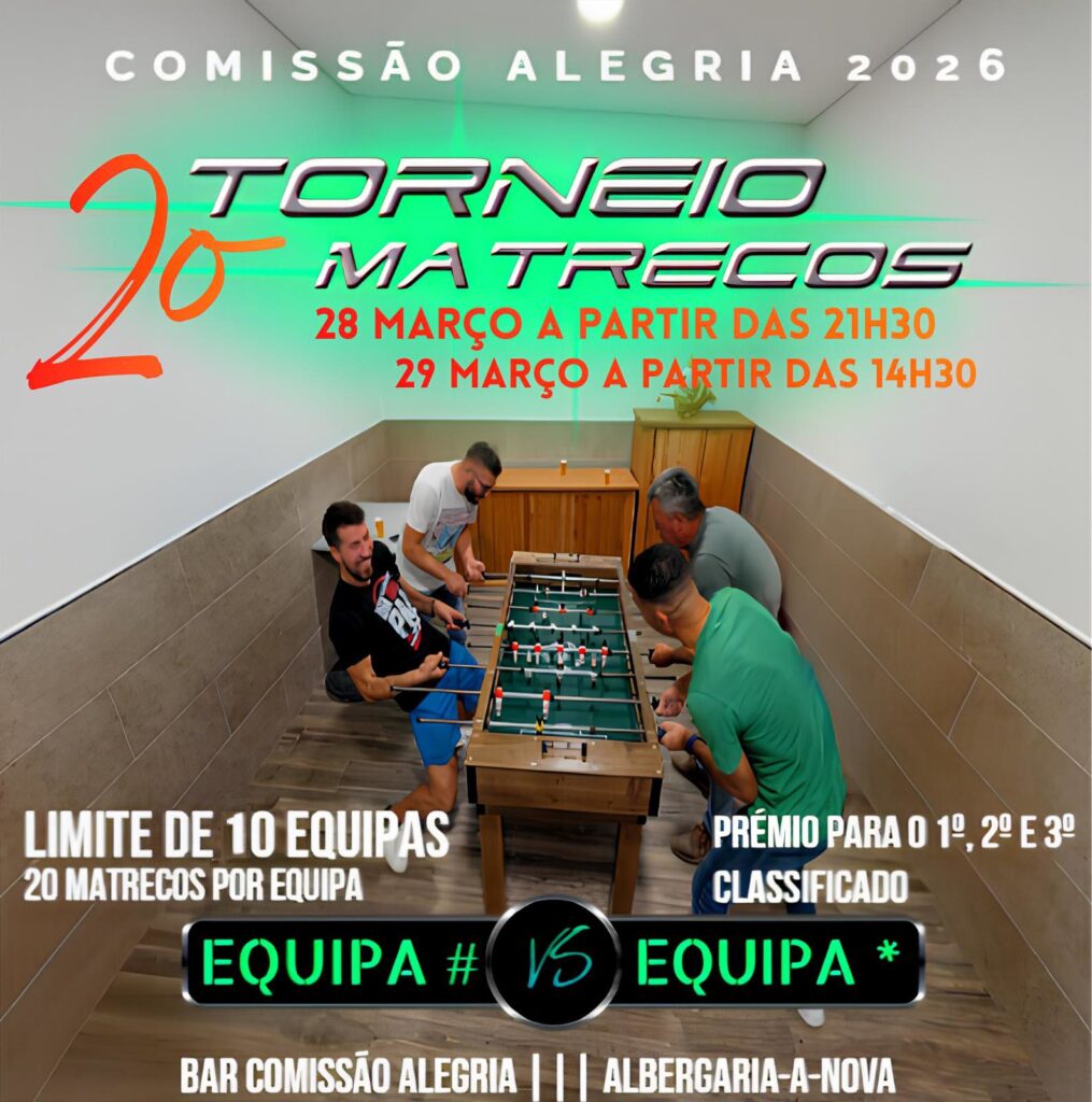 A Comissão de Festas Sr.ª Alegria prepara a 2.ª edição do Torneio de Matrecos, que decorre nos dias 28 e 29 de março, no Bar Comissão Alegria, em Albergara-a-Nova, freguesia da Branca. As partidas começam às 21h30 de sábado e retomam às 14h30 de domingo.