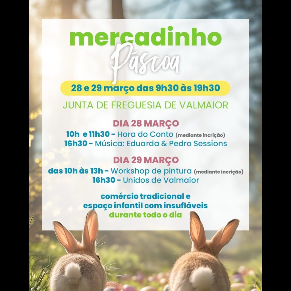 A Junta de Freguesia de Albergaria-a-Velha e Valmaior assinala a época das amêndoas e coelhinhos com um “Mercadinho de Páscoa”, nos dias 28 e 29 de março, na Junta de Freguesia de Valmaior, aberto das 9h30 às 8h30. O encontro junta histórias, música, pintura e associativismo.