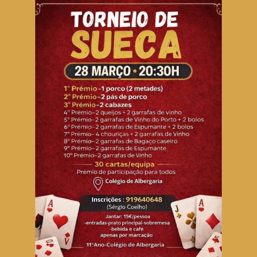 A turma de 11.º ano do Colégio de Albergaria convida a comunidade para um Torneio de Sueca, no próximo sábado, 28 de março, às 20h30, nas instalações do estabelecimento escolar.