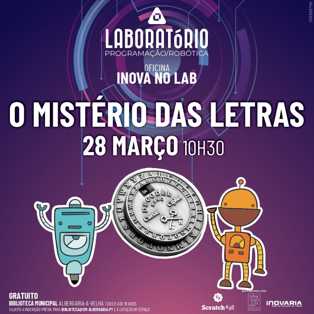‘O Mistério das Letras’ é o tema da próxima Oficina Robótica, a realizar-se na Biblioteca Municipal, às 10h30. As inscrições para a sessão do Laboratório de Programação e Robótica são feitas através do e-mail biblioteca@cm-albergaria.pt