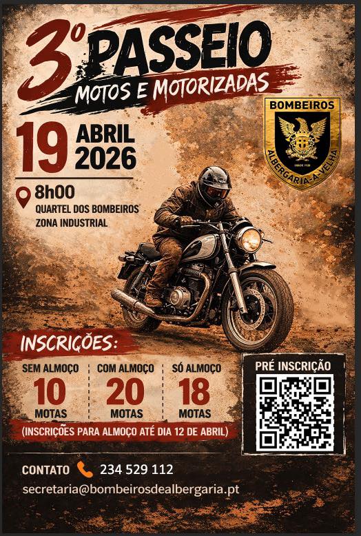 O Quartel dos Bombeiros de Albergaria, na Zona Industrial, recebe, a partir das 8h, o 3.º Passeio de Motos e Motorizadas organizado pela corporação. As inscrições encerraram a 12 de abril.