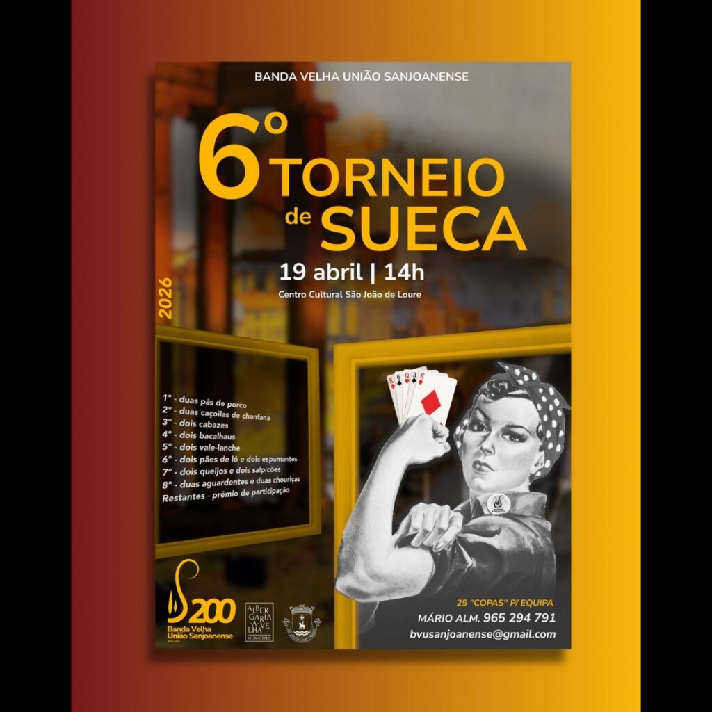 A Banda Velha União Sanjoanense organiza a 6.ª edição do Torneio de Sueca BVUS, uma iniciativa de angariação de fundos que terá lugar no Centro Cultural de São João de Loure, a partir das 14h.