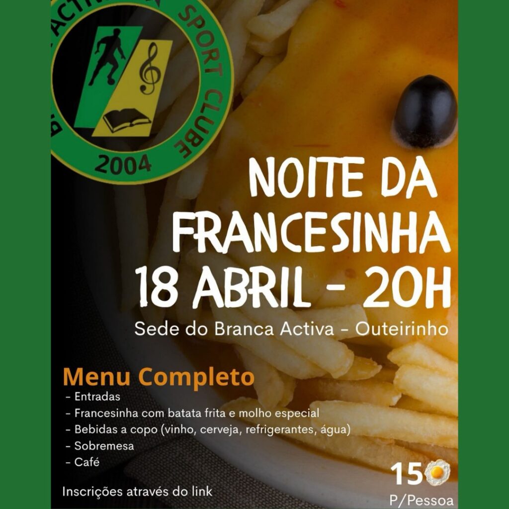 O Branca Activa Sport Clube prepara uma ‘Noite da Francesinha’, às 20h, na sede do grupo, em Outeirinho. O evento propõe um jantar convívio com um menu completo que inclui francesinha com batata frita, bebidas, sobremesa e café.