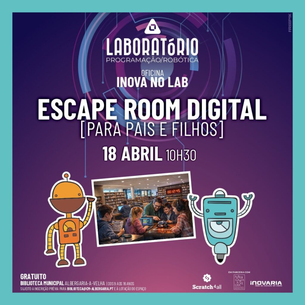 A Biblioteca Municipal de Albergaria-a-Velha recebe, às 10h30, mais uma oficina “Inova no Lab”, dedicada a um escape room digital pensado para pais e filhos. A participação é gratuita, mas sujeita a inscrição – feita através do e-mail biblioteca@cm-albergaria.pt.