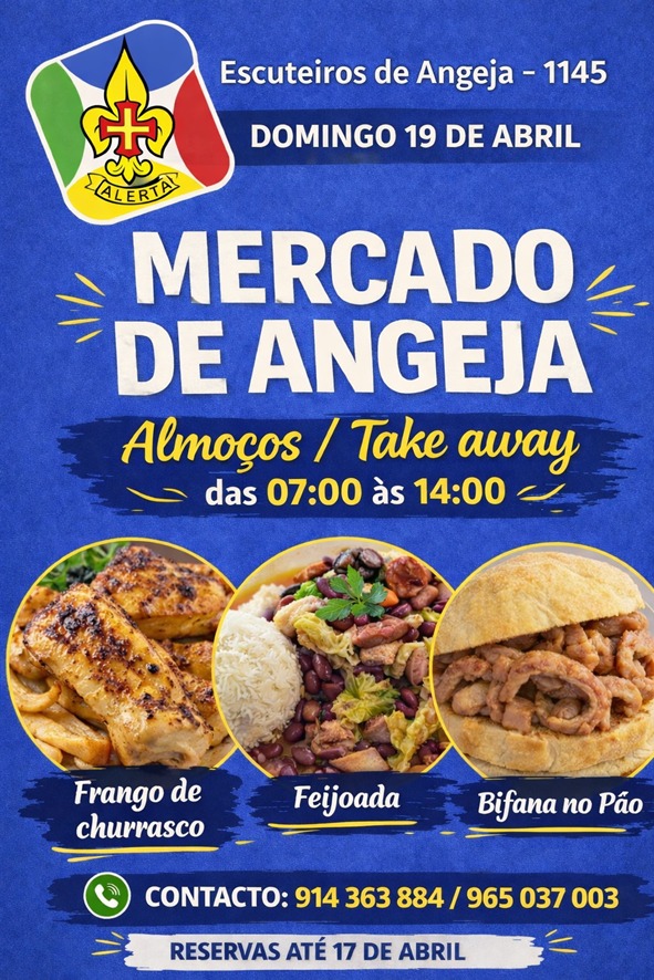 A Feijoada Especial, “feita com todo o saber, dedicação e aquele tempero caseiro que já conhece”, como convidam os escuteiros, está à sua espera no Mercado de Angeja, com recolha das 7h às 14h. Frango de churrasco e bifana no pão compõem igualmente o menu.