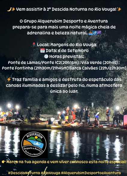 A 2.ª Descida Noturna do Rio Vouga, organizada pelo grupo Desporto e Aventura de Alquerubim, convida a população a vir ver o espetáculo ao luar, estando as inscrições esgotadas para participar na atividade.