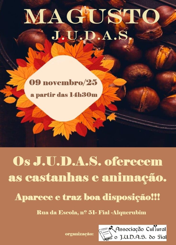 9 de novembro – Magusto Judas – A Judas – Associação Cultural celebra o São Martinho a partir das 14h30, na sede do grupo, na Rua da Escola, no Fial. A coletividade oferece castanhas e promete uma tarde animada, que contará com a atuação da Associação Sons da Concertina Margens do Vouga, de Alquerubim.