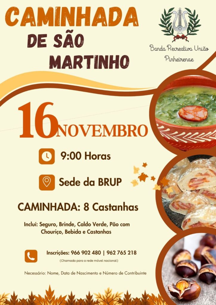 16 de novembro – Caminhada São Martinho BRUP – A Banda Recreativa União Pinheirense (BRUP) organiza a tradicional Caminhada de São Martinho, convidando a comunidade a participar num percurso que promete conjugar exercício, convívio e as iguarias típicas da época, pelas 9h, na sede do grupo.