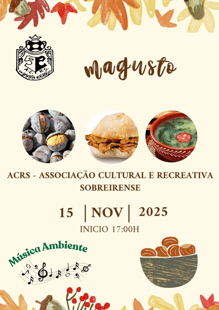 15 de novembro – Magusto ACR Sobreirense – O Magusto da Associação Cultural e Recreativa Sobreirense vai animar a comunidade e celebrar o São Martinho a partir das 17h, na sede da associação, no Sobreiro.O evento promete viajar na tradição do São Martinho, com castanhas quentinhas assadas, bifanas, caldo verde e música ambiente.