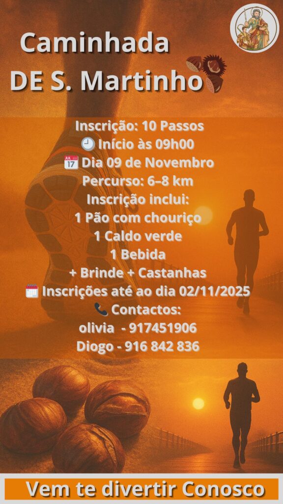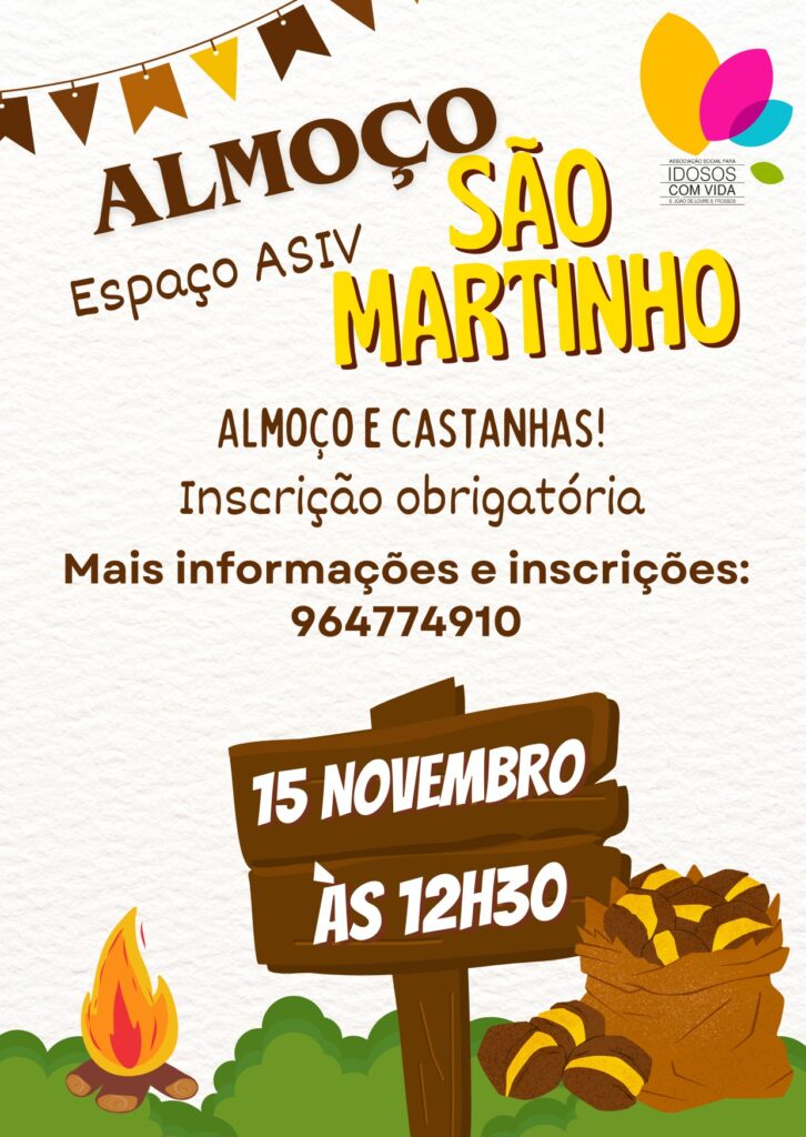 15 de novembro – Almoço de São Martinho ASIV – O aroma das castanhas assadas anuncia a chegada de mais um São Martinho, e a ASIV – Associação Social Para Idosos com Vida prepara-se para celebrar a tradição com um almoço convívio aberto a toda a comunidade. O evento decorre a partir das 12h30, nas instalações da ASIV, e promete ser uma tarde de convívio, música e saborosas castanhas. Inscrição e para mais informações através do número 964 774 910.