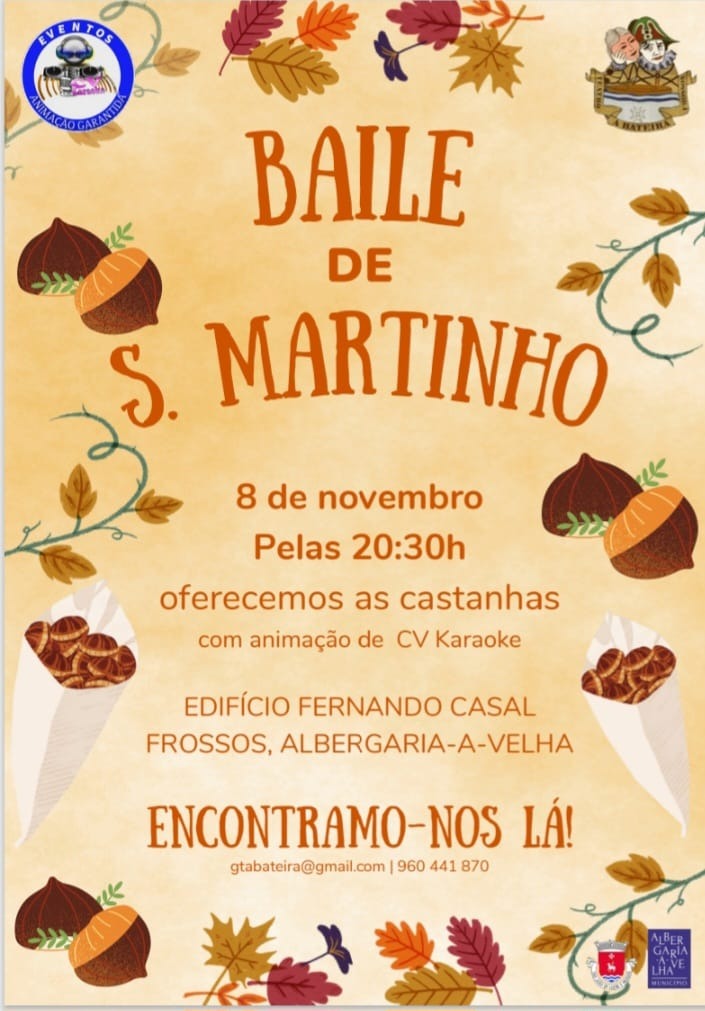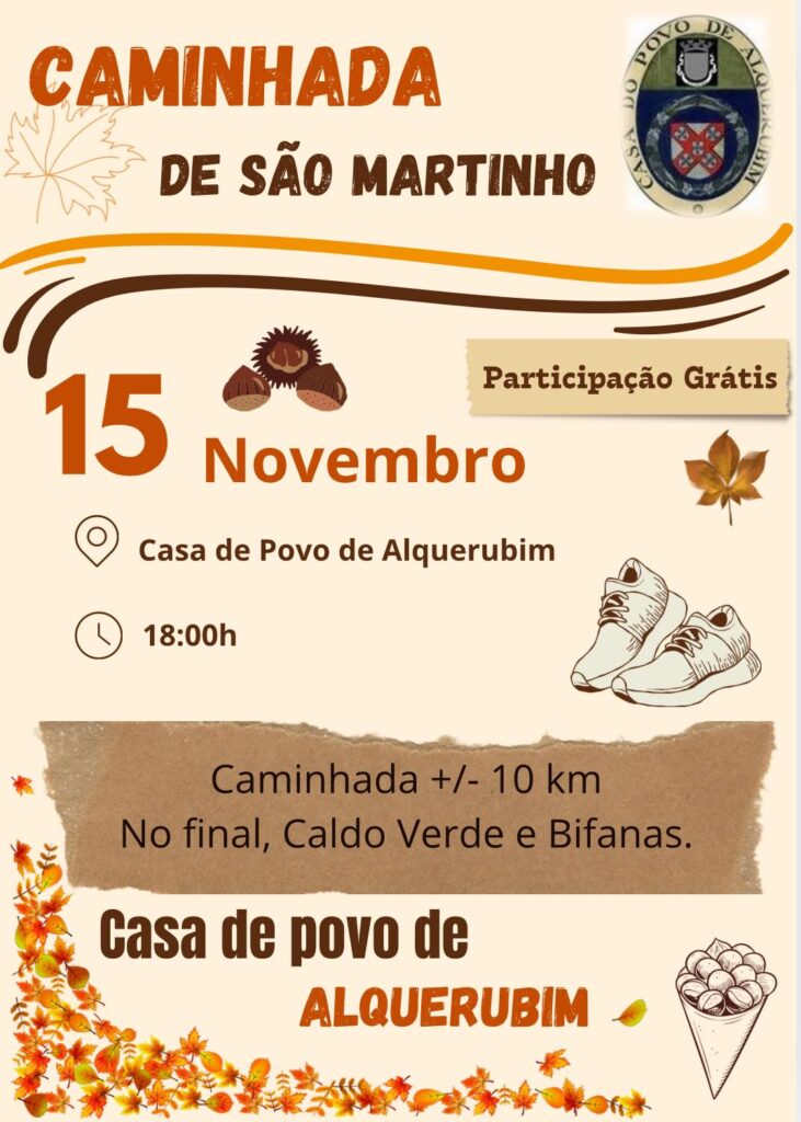 15 de novembro – Caminhada Noturna São Martinho – A Casa do Povo de Alquerubim convida a comunidade a juntar-se à Caminhada de São Martinho da coletividade, no dia 15 de novembro, com partida da sede do grupo às 18h. A participação é gratuita e, no final dos 10 km de passeio, serão servidos caldo-verde e bifanas.