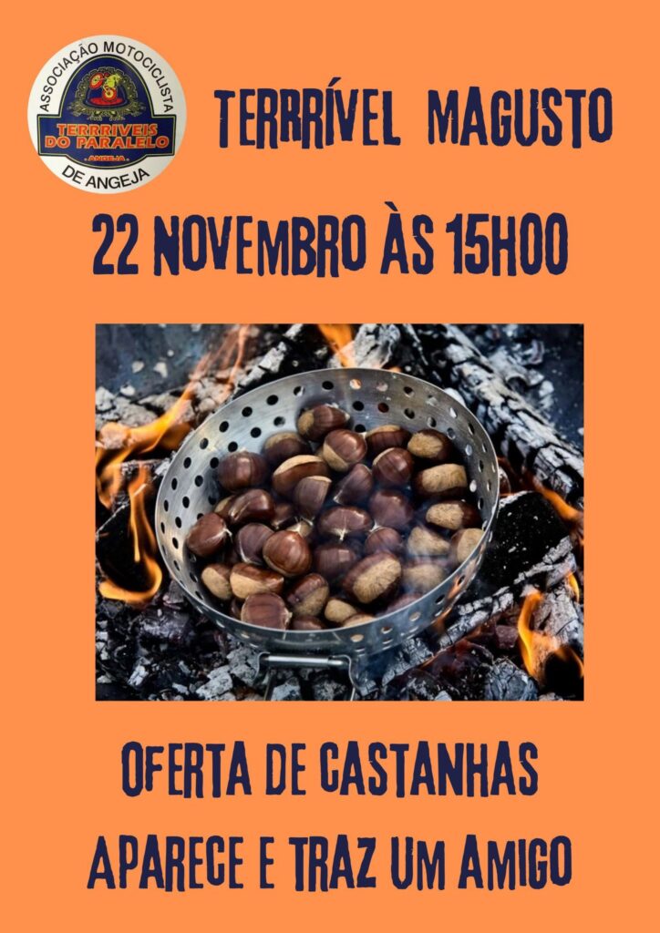 22 de novembro – Terrível Magusto – A Associação Motociclista Terríveis do Paralelo vai celebrar o São Martinho com o seu já tradicional “Terrível Magusto”, marcado para as 15h na sede do clube. O evento promete uma tarde de convívio e boa disposição, onde não faltarão castanhas assadas.
