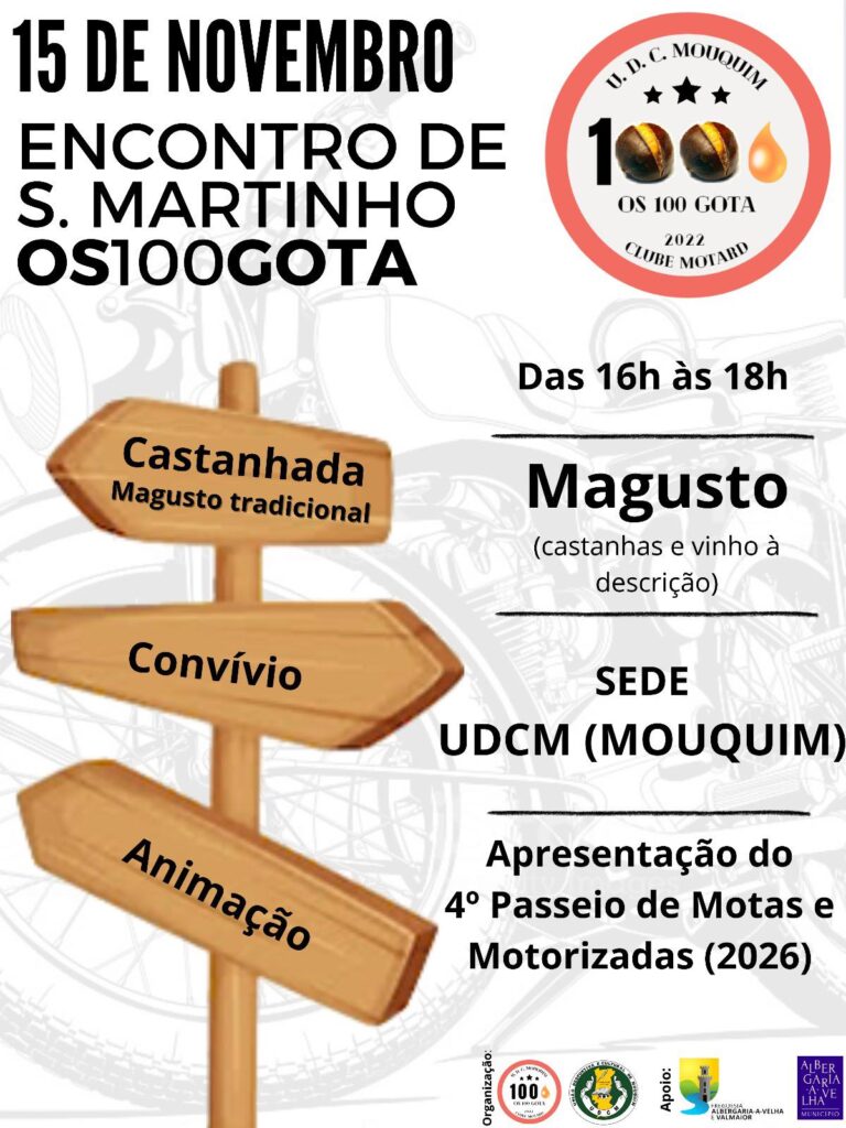 15 de novembro – S.Martinho d’Os100Gota – Grupo Motard ‘Os 100 Gota’ celebra, como já é tradição o São Martinho na sede da UDCM, em Mouquim. Este ano entre as 16h e as 18h. O evento inclui um magusto tradicional, com castanhas e vinho, e promete convívio e animação. Durante a tarde, será também apresentada a próxima edição do Passeio de Motas e Motorizadas, prevista para 2026.