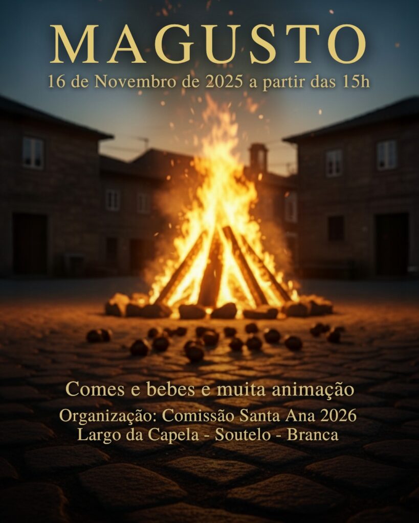 16 de novembro – Magusto Santa Ana – A Comissão de Festas de Santa Ana vai comer castanhas e beber o vinho novo no dia 16 de novembro, a partir das 15h, junto no Largo da Capela de Soutelo, na freguesia da Branca. Os mordomos convidam a comunidade para uma tarde de animação.