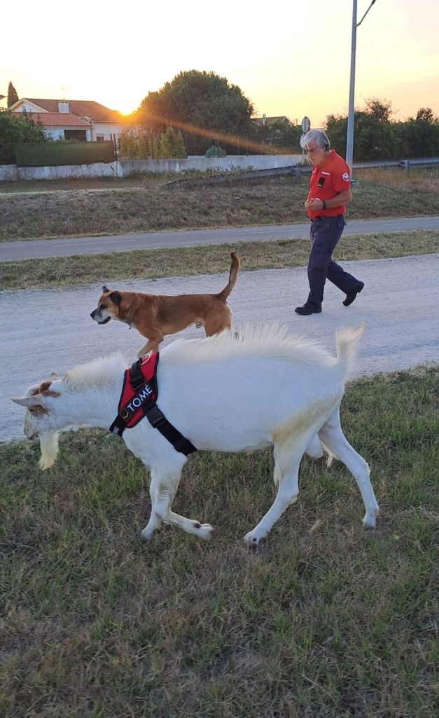 Tomé sai da casota todos os dias, para ir passear no jardim à beira da rotunda, junto ao Quartel. “Esta interação torna-o muito comunicativo e inteligente nas suas atitudes. É quase um cão no corpo de um bode, é muito engraçado. Já sabe quando é para pôr o colete, para ir passear…”, sorria o bombeiro.