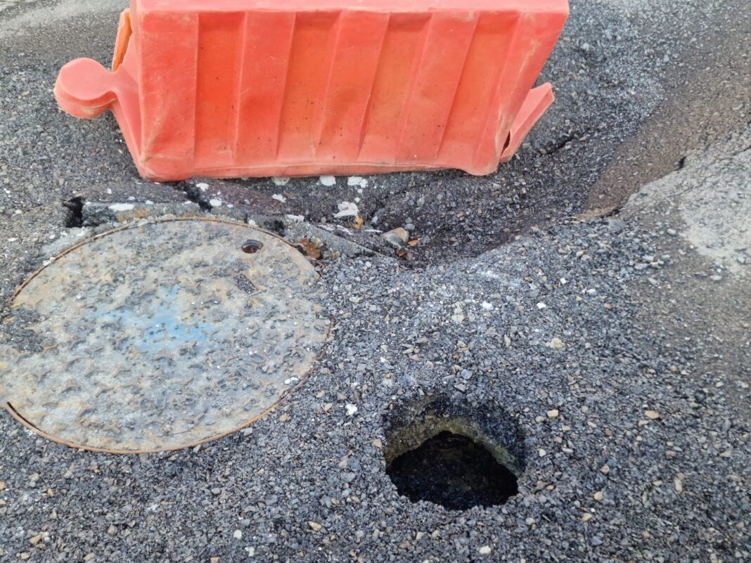 As tampas das águas residuais abateram, bem como parte do asfalto, criando sulcos e buracos, na Estrada Nacional 16, quilómetro 27, em Mouquim (Valmaior), no decurso de uma obra de saneamento da responsabilidade da AdRA – Águas da Região de Aveiro. A sinalização de perigo não se afigura suficiente para avisar os condutores do risco eminente.
